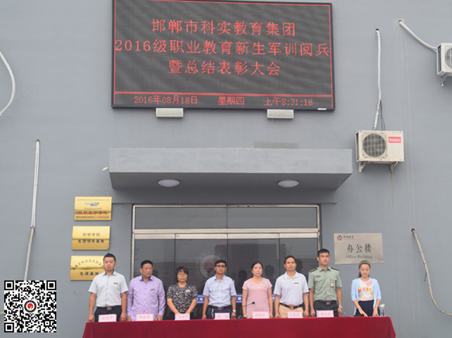 2016年8月18日,在嘹亮的軍歌聲中,冀南新區(qū)校區(qū)2016級職業(yè)教育新生軍訓閱兵暨總結(jié)表彰大會在操場隆重舉行,集團校長張璽、副校長梁曉燕、市場運營中心校長劉金芳、行政管理中心常務副校長陳繼軍、冀南新區(qū)校區(qū)副校長王建福、校長助理趙亮亮、軍訓教導大隊隊長李延亮和教官們及全校師生參加大會。